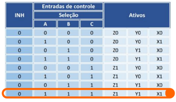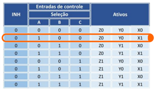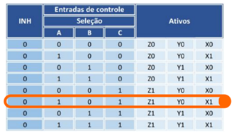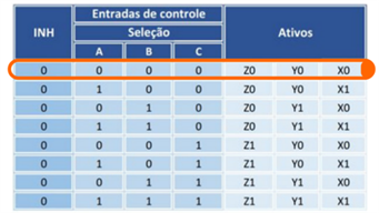 A chave A está setada em ON com nível lógico alto, e as chaves B e C estão setadas em OFF, com nível lógico baixo o que ativa os canais Z0, Y0 e X1.