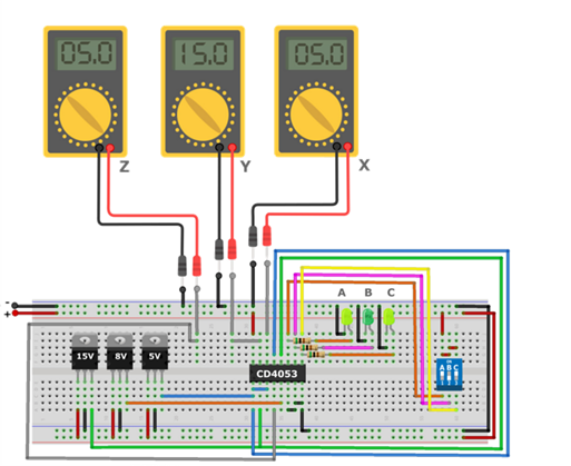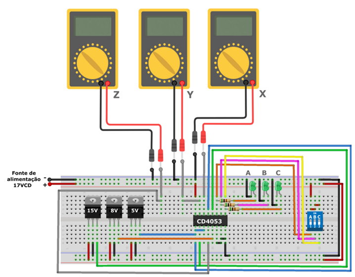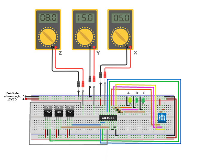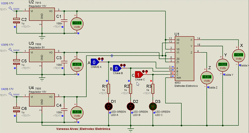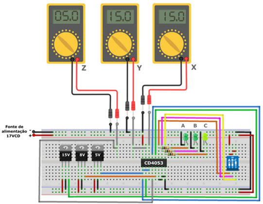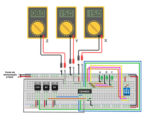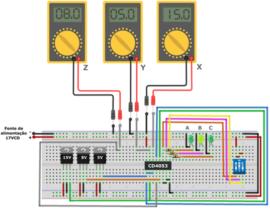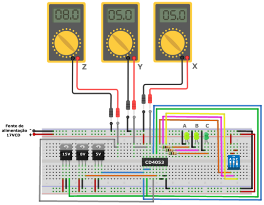 O diagrama de simulação criado no Proteus, que pode ser visto a seguir, demonstra a resposta comutada em Z de 8V, referente a tensão do canal Z0, a resposta em Y de 5V referente a tensão do canal Y1, e a resposta em X de 15V referente a tensão do canal X0.