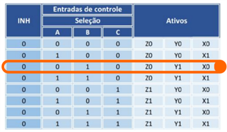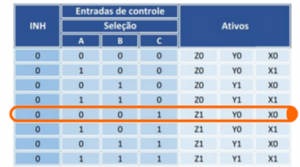 A chave A está setada em OFF com nível lógico baixo, a chave B está em ON com nível lógico alto e a chave C em OFF, com nível lógico baixo o que ativa os canais Z0, Y1 e X0.