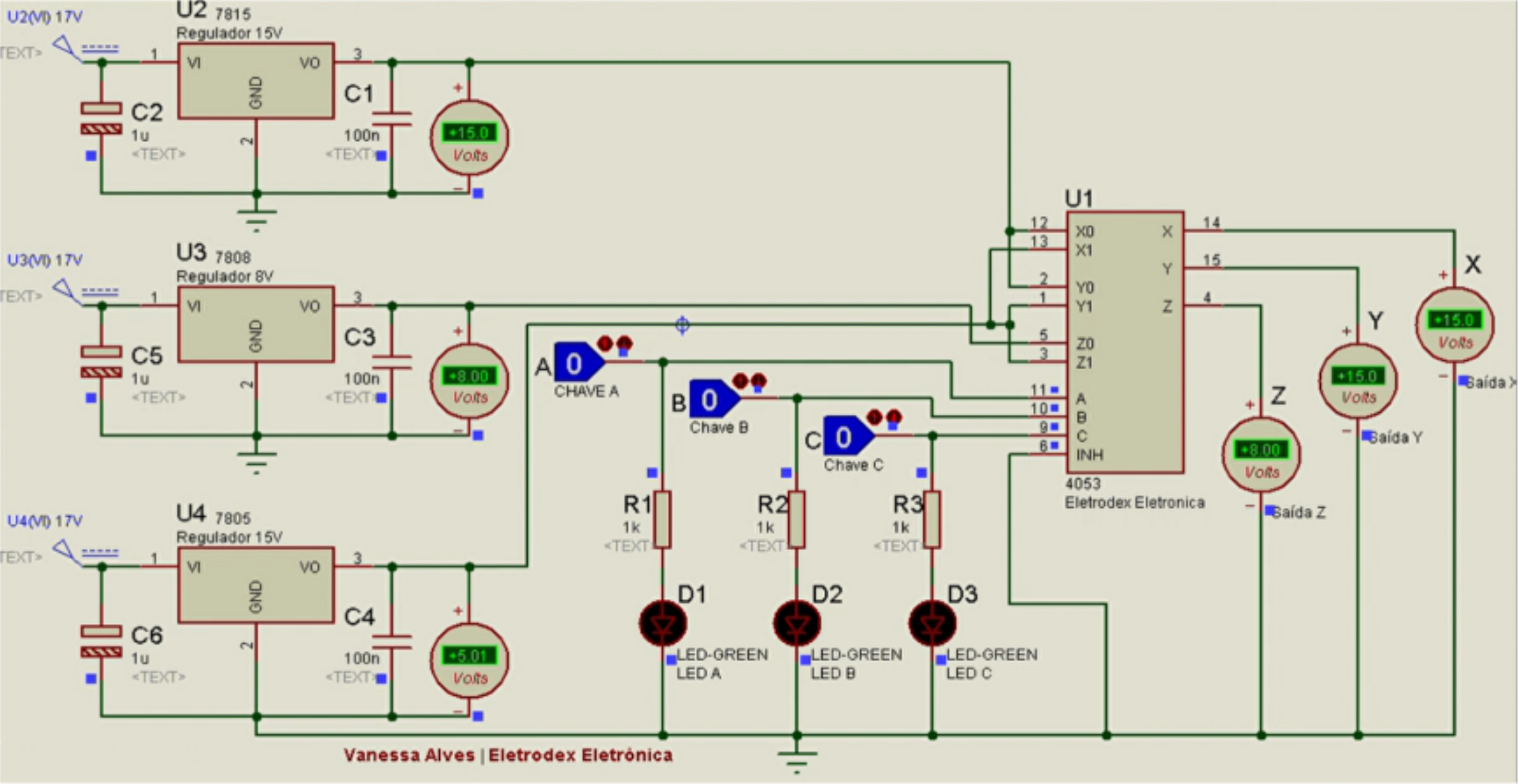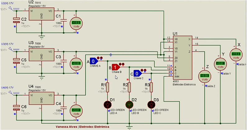 O diagrama de simulação criado no Proteus, que pode ser visto a seguir, demonstra a resposta comutada em Z de 8V, referente a tensão do canal Z0, a resposta em Y de 15V referente a tensão do canal Y0, e a resposta em X de 5V referente a tensão do canal X1.