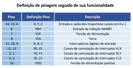 OBS: O 4053 possui uma ampla faixa de tensão analógica: VDD-VEE = 3V à 18V. Vale ressaltar que VEE deve ser VSS, e sendo assim, recomenda-se conectá-lo diretamente ao GND como descrito acima.